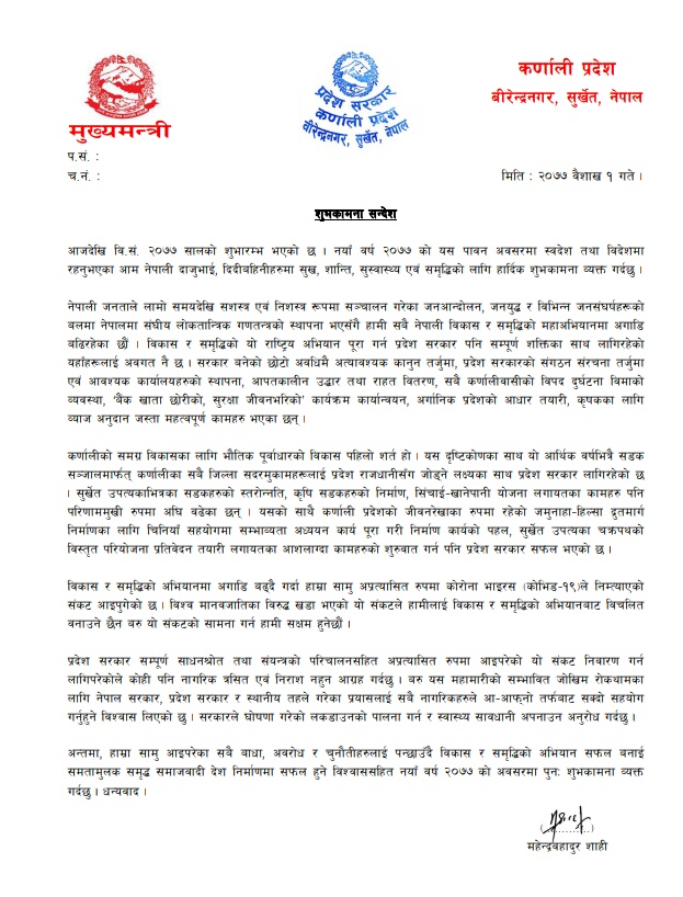 १ बैशाख, सुर्खेत । कर्णाली प्रदेश सरकारका मुख्यमन्त्री महेन्द्रबहादुर शाहीले एक विज्ञप्ती जारी गर्दै आज देखि शुभारम्भ भएको विक्रम सम्बत् २०७७ सालको शुभकामना व्यक्त गर्नुभएको छ ।