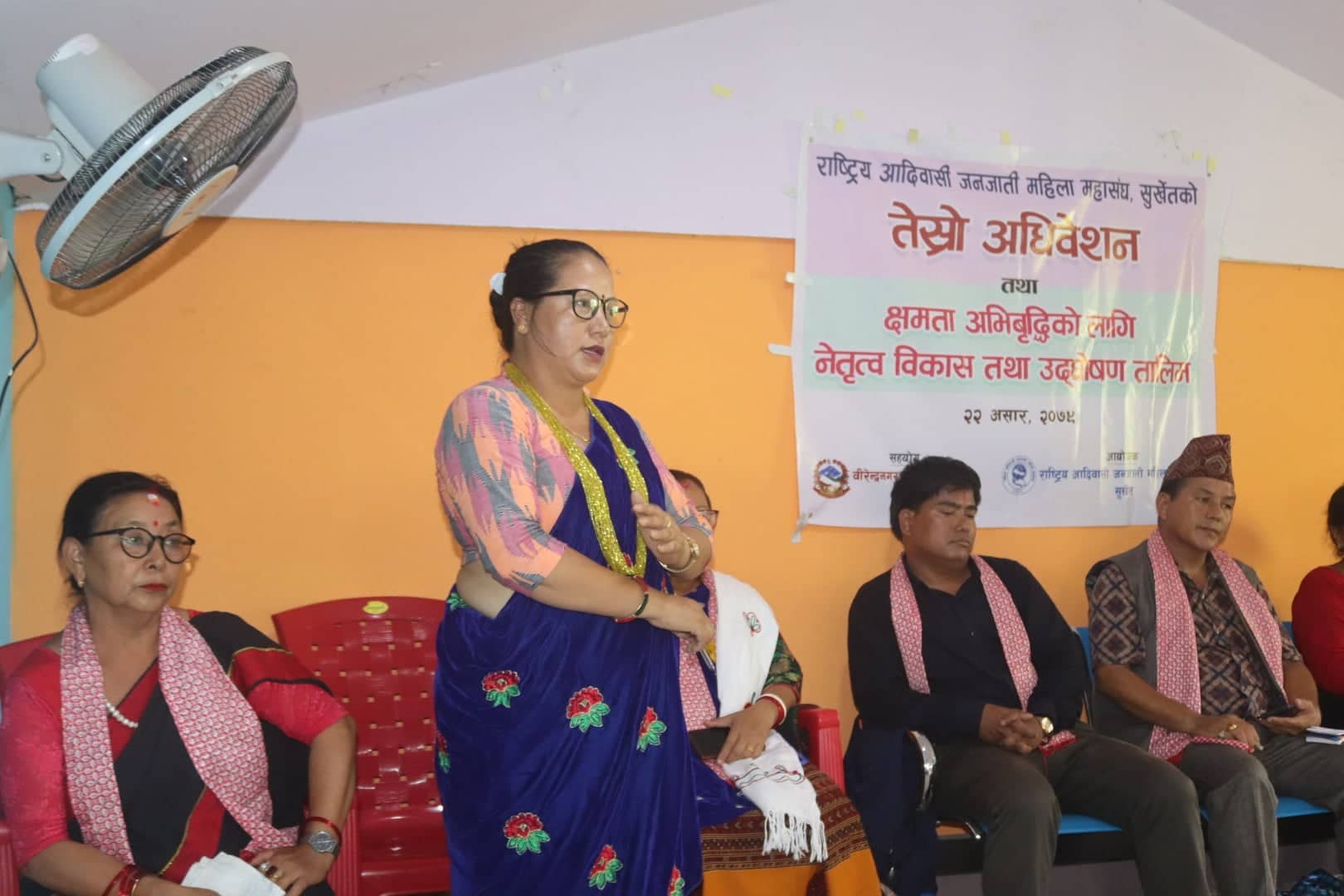 २२ असार,सुर्खेत । राष्ट्रिय आदिवासी जनजाति महिला महासंघ,सुर्खेतको तेस्रो अधिवेशन आज वीरेन्द्रनगरमा सम्पन्न भएको छ ।