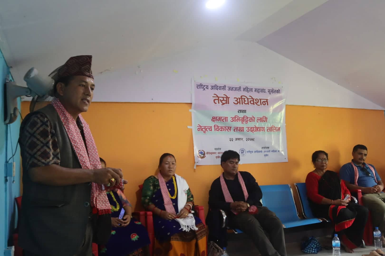राष्ट्रिय आदिवासी जनजाति महिला महासंघ,सुर्खेतका अध्यक्ष तीला श्रेष्ठको सभापतित्वमा सम्पन्न अधिवेशनका अथिति एवंम् नेपाल आदिवासी जनजाति जिल्ला समन्वयन परिषद सुर्खेतका निर्वतमान सदस्य मानबहादु चौधरीले आदिवासीहरु कसैले देला र गरौला भनेर अरुको आशमा बस्नु नपर्ने बताउनु भएको छ । जनजातिहरु ईमान्दारी भएकै हिसाबले नेतित्व लिनलाई पछाडि पर्ने परिपाती अब नरहेको र अब जनजातिहरु कसैको आशमा नपरी आफैले नेतित्व लिन समक्ष भएका छौ ।