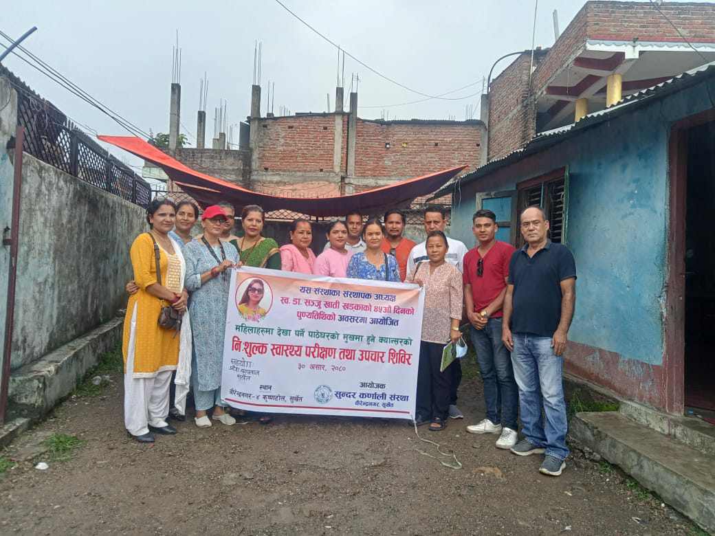 ३०,असार सुर्खेत । सुन्दर कर्णाली सस्थाका संस्थापक अध्यक्ष स्वर्गिय डा. सन्जु खड्काको ४५ औं पुण्यतिथिको अबसरमा शनिवार (आज) वीरेन्द्रनगरमा निशुल्क स्वास्थ्य शिविर संचालन गरिएको छ ।