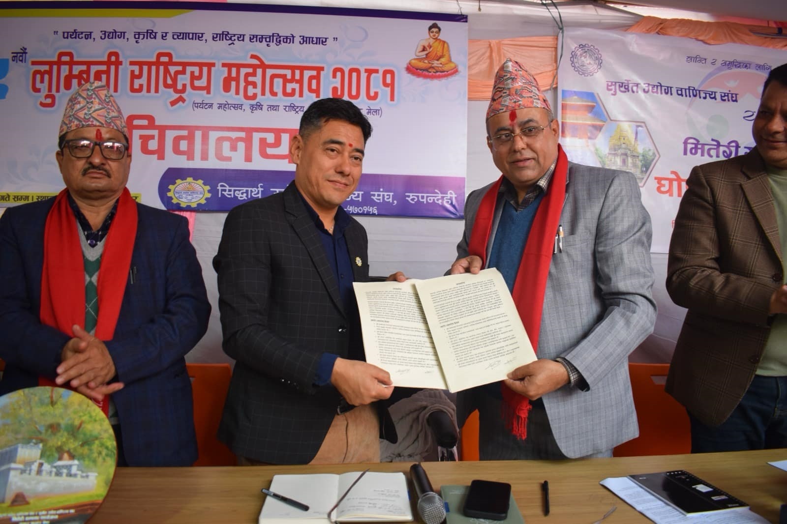 कर्णाली प्रदेश राजधानीको सुर्खेत उद्योग वाणिज्य संघ र लुम्बिनी प्रदेशको औद्योगिक शहर भैरहवाको सिद्धार्थ उद्योग वाणिज्य संघ,रुपन्देहीबीच मितेरी सम्बन्ध कायम गरिएको छ । दुबै संघबीच आपसी सम्बन्ध सुदृढिकरण र आर्थिक विकासमा महत्वपूर्ण योगदान दिनेगरी समन्वय र सहकार्य गर्ने उद्देश्यले दुई उद्योग वाणिज्य बीच मितेरी सम्बन्ध कायम गरिएको हो ।
