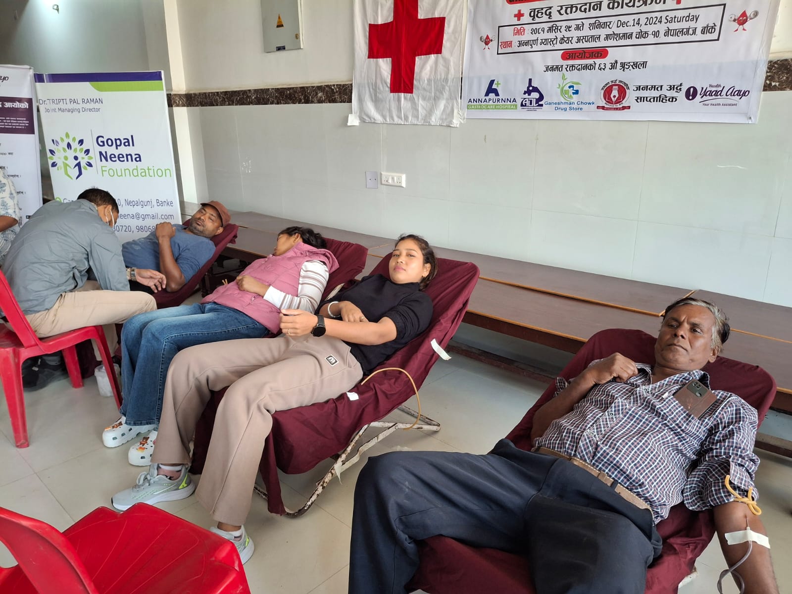 बाँके जिल्लामा अहिले रगतको अभाव भइरहेको अवस्थालाई मध्यनजर गर्दै “रक्तदान गरौंः जीवन उपहार दिउँ” भन्ने नाराका साथ जनमत रक्तदान अभियानको ६३ औं श्रृङ्खलामा सम्पन्न उक्त कार्यक्रम पाँच जना महिला सहित ५१ जनाले रक्तदान गरेको गोपाल–नीना फाउण्डेशनका सहनिर्देशक डा. तृप्ती पाल रमणले जानकारी दिनु भयो ।