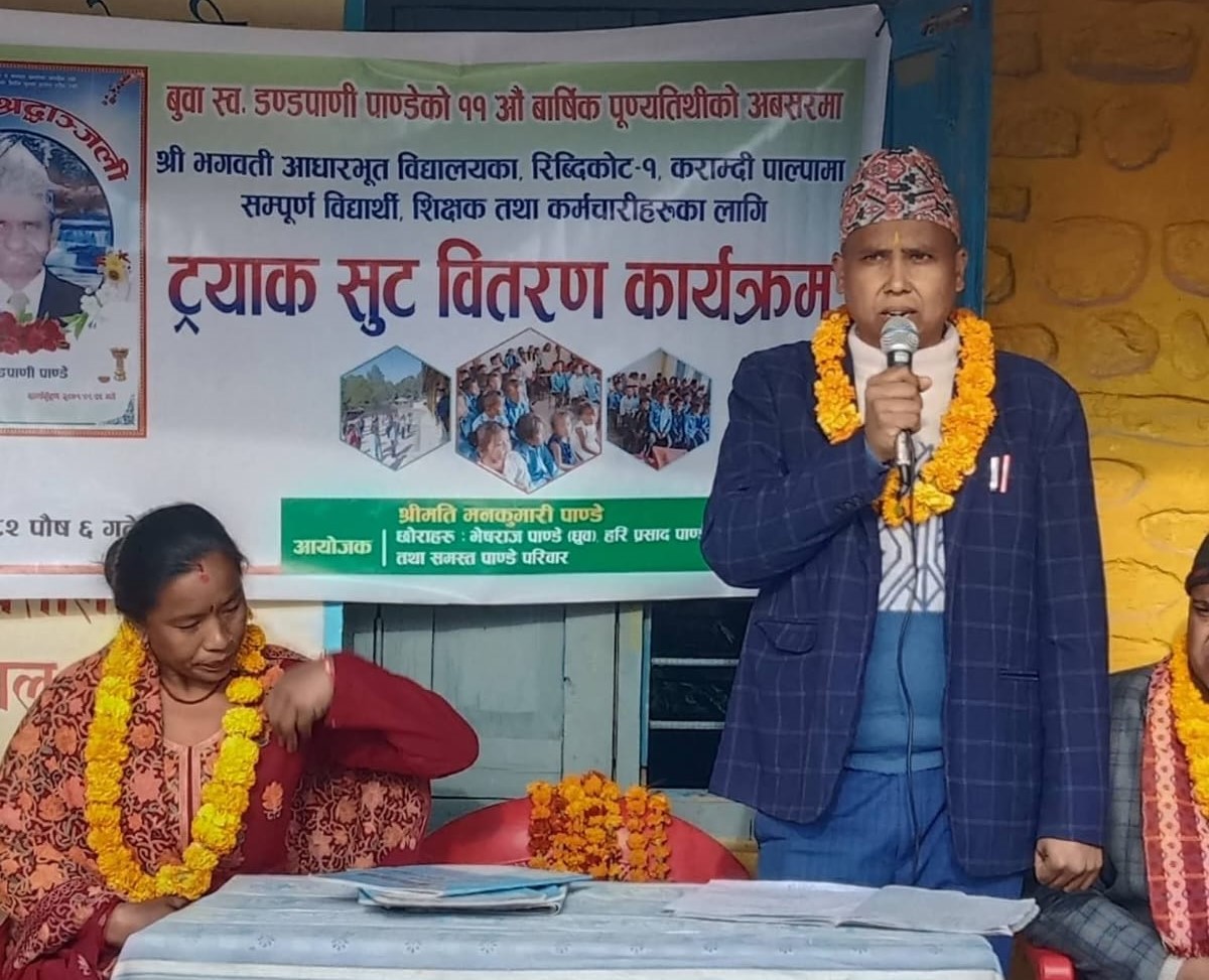 ७ पौष, पाल्पा। स्वर्गीय डण्डपाणि पाण्डेको ११औँ वार्षिक पुण्यतिथिको अवसरमा पाल्पा जिल्लाको रिद्धिकोट गाउँपालिका–१ कराम्दीस्थित श्री भगवती आधारभूत विद्यालयमा अध्ययनरत विद्यार्थीहरूलाई ट्र्याकसुट वितरण गरिएको छ।